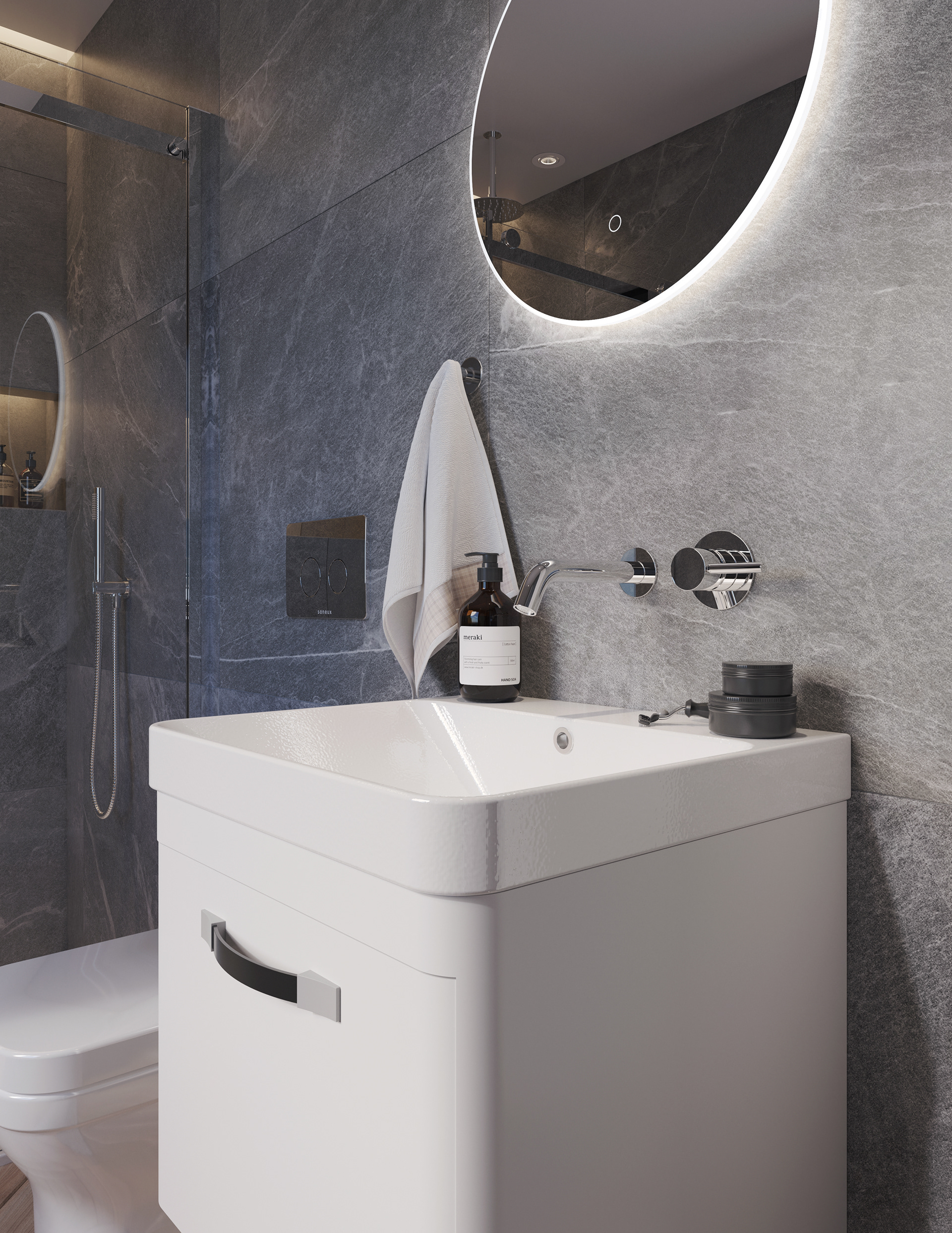 Render of an Ensuite to showcase the Hyde Basins. The average size of the bathroom is to ensure people can feel like they can achieve a similar look.