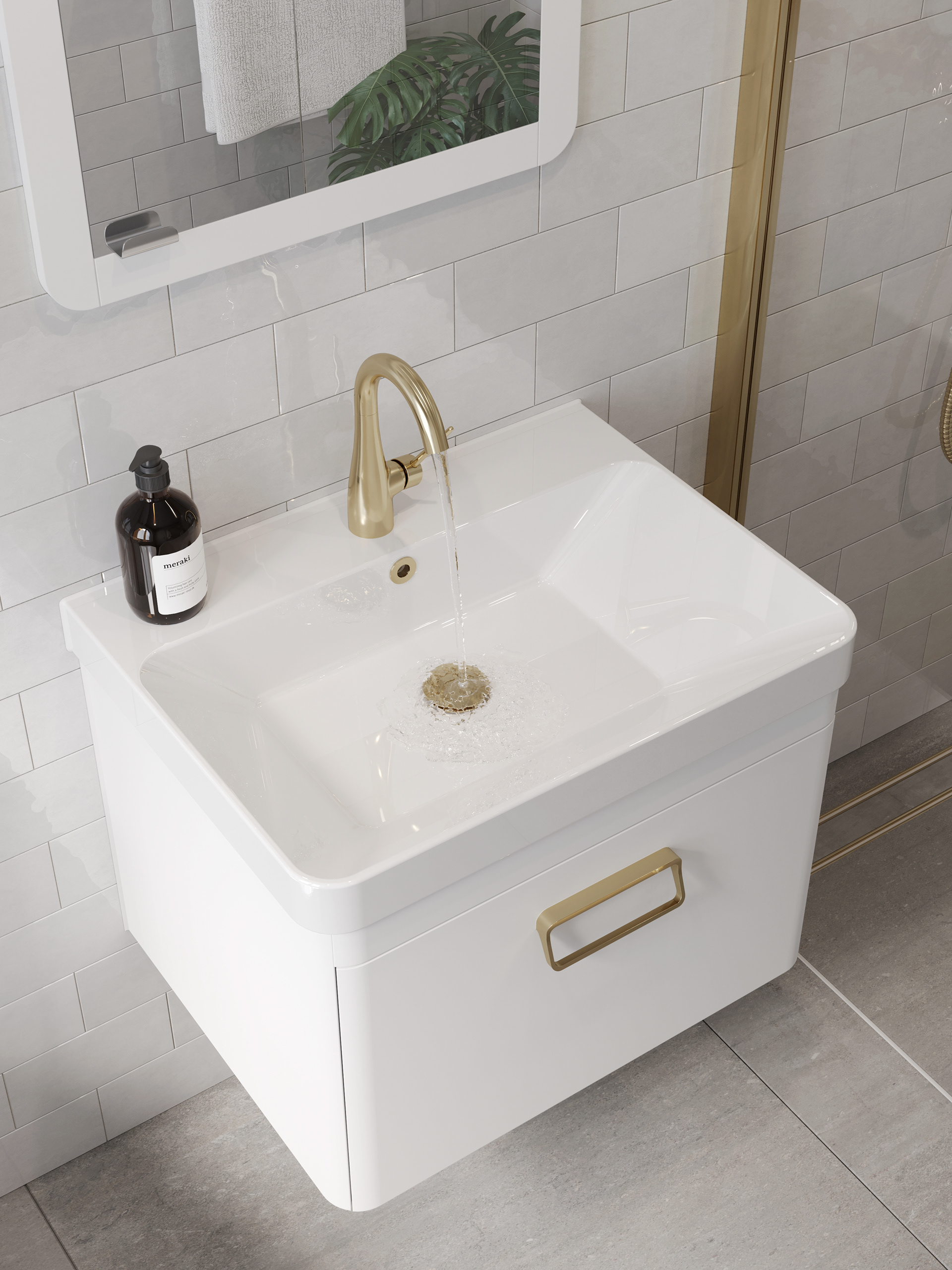 Second sets of bathroom renders showcasing Sanuex's Hyde range in a dazzling white interior setup with warm gold and brass accents.